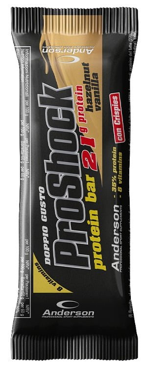 Proteine del latte, sciroppo di zucchero invertito, sciroppo di fruttosio, crispies di proteine di soia (7,2%) (isolato di proteine di soia, farina di riso, farina di soia, sale), zucchero, gelatina (bovina), latte intero in polvere, burro di cacao, sciroppo di glucosio, pasta di cacao, umidificante: glicerolo; pasta di nocciole, olio di palma, isolato di proteine del siero del latte, nocciole (1%), lattosio, acido L-ascorbico, emulsionante: lecitina di girasole; DL-alfa-tocoferil acetato, aromi, glucosio, nicotinamide, aroma naturale vaniglia, calcio-D-pantotenato, maltodestrina, piridossina cloridrato, riboflavina, tiamina mononitrato, cianocobalamina.