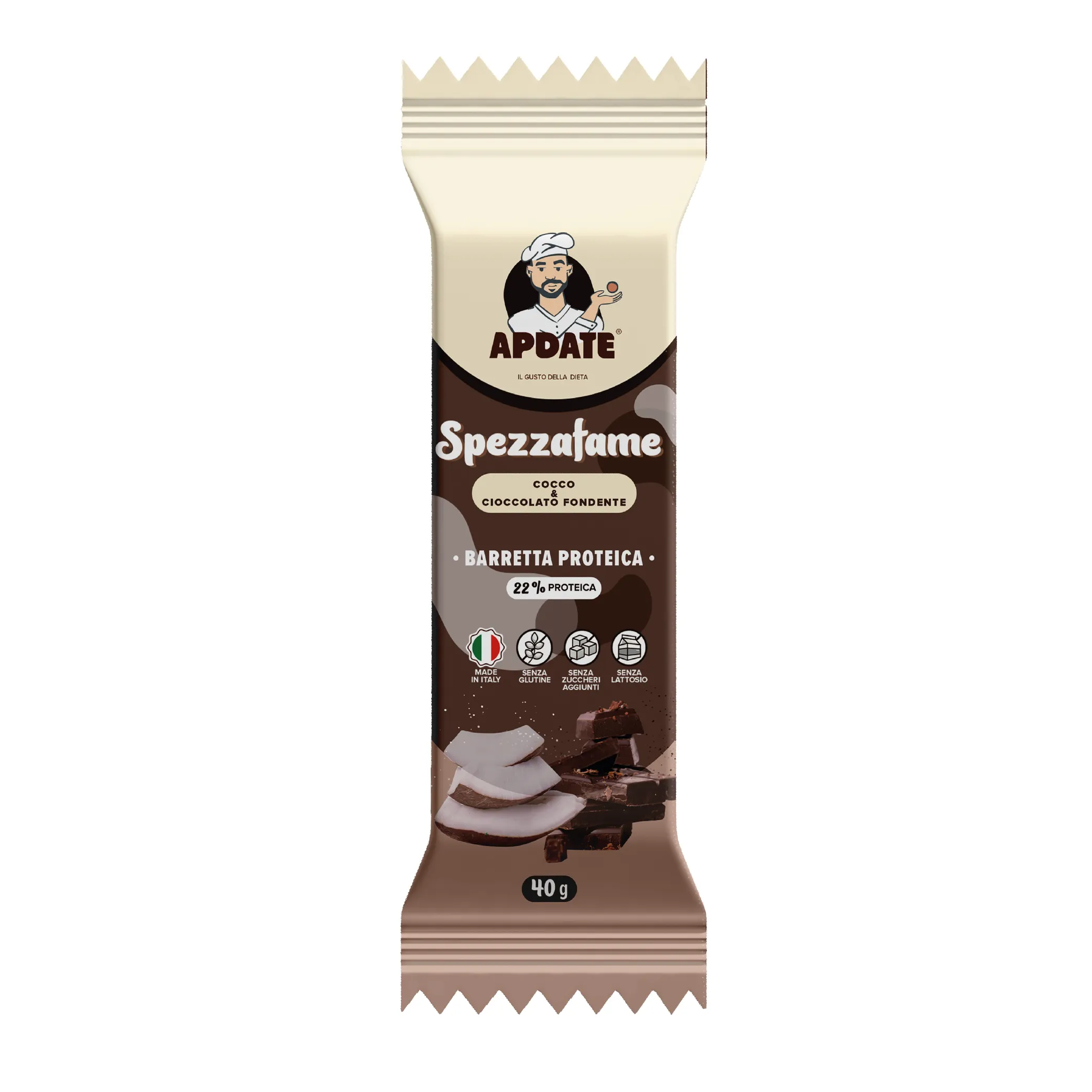 Descrizione estesa BARRETTA PROTEICA SPEZZAFAME COCCO CIOCCOLATO FONDENTE 40 G