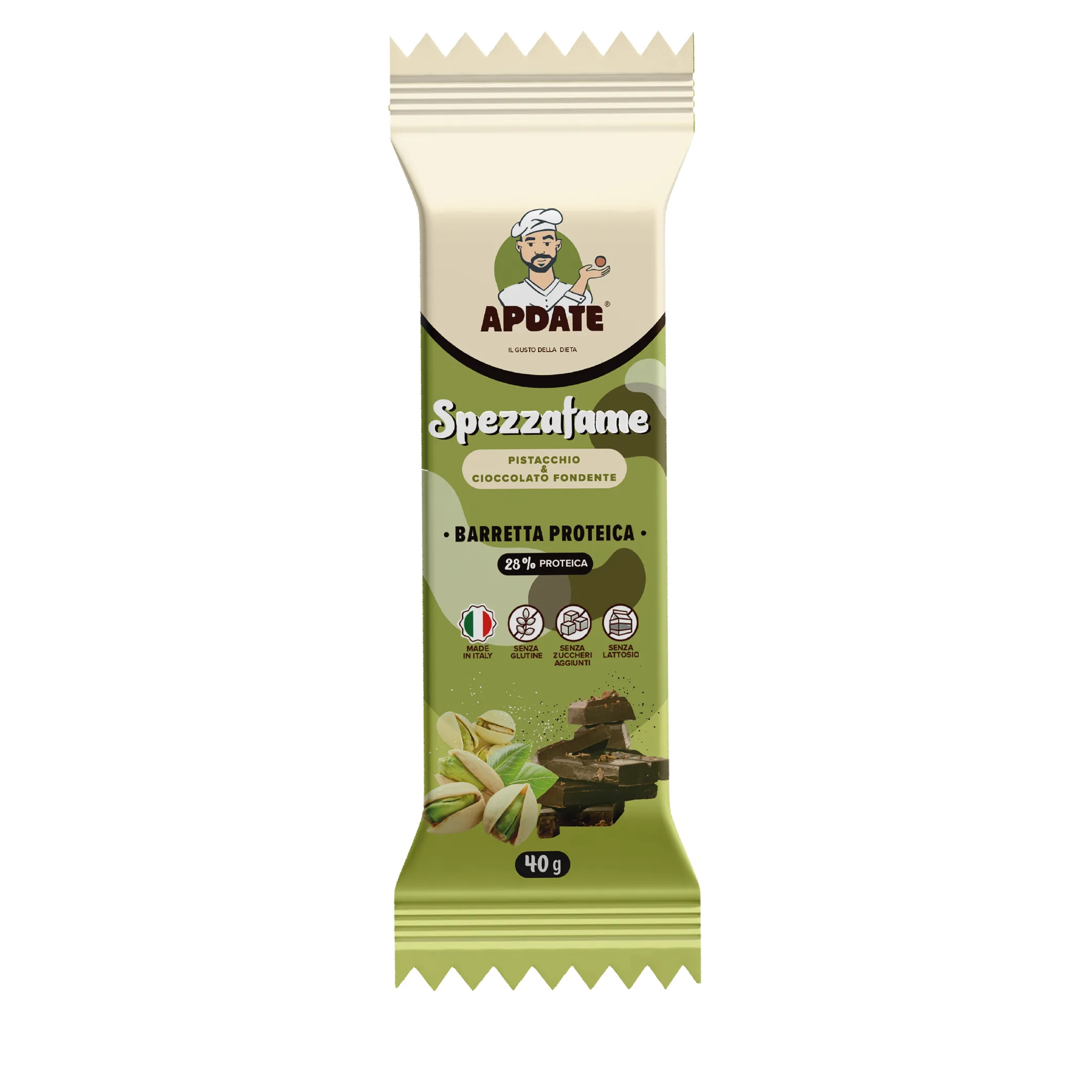 Descrizione estesa BARRETTA PROTEICA SPEZZAFAME PISTACCHIO CIOCCOLATO FONDENTE 40 G