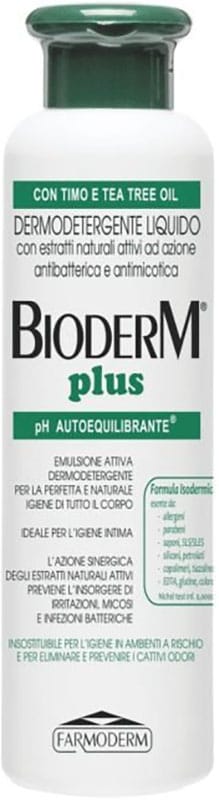 Bioderm Plus Detergente Antibatterico è un fluido detergente a base di Timo e Tea Tree Oil. Indicato per la detersione di tutto il corpo, anche per le parti intime. Oltre ad assicurare una perfetta igiene naturale, previene le irritazioni, infezioni batteriche e micosi, svolge una benefica azione decongestionante, favorisce il ripristino dei diversi pH alterati, ricostituisce le naturali barriere dermoprotettive.