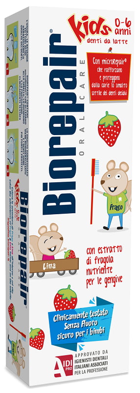 Dentifricio con microRepair che rinforza e remineralizza i denti dei bambini, soprattutto dopo l’uso di apparecchi ortodontici. È adatto anche ai bambini al di sotto dei 7 anni, in quanto non contiene fluoro. Oltre al fluoro, non contiene silici abrasivi, parabeni, biossido di titanio, sodium lauryl sulfate (SLS). Il sapore è fresco e fruttato; gli estratti di fragola tonificano e nutrono le gengive.