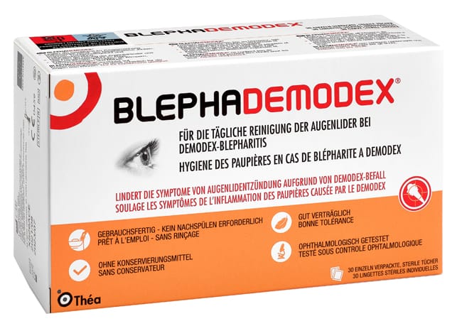 BLEPHADEMODEX pulisce croste, forfora, impurità e agenti infettivi su palpebre e ciglia. Migliora i sintomi legati all’infezione da Demodex, come prurito, bruciore, secchezza e infiammazione del margine delle palpebre. Il rossore delle palpebre e le sensazioni di corpi estranei sono ridotti.