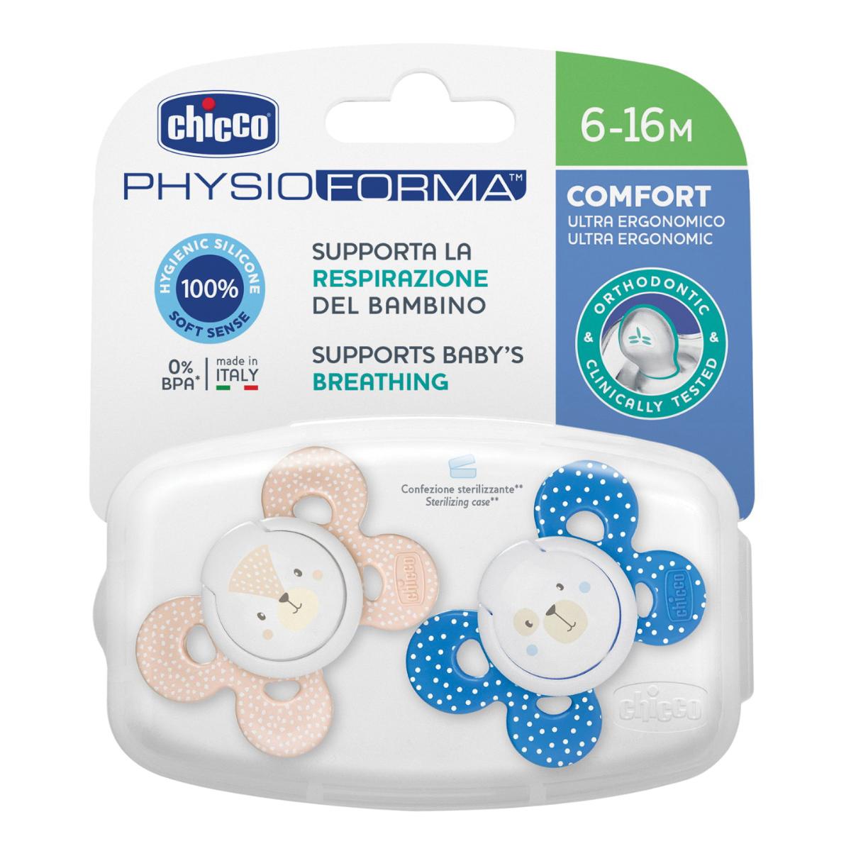 Il succhietto è in silicone e, grazie alla sua esclusiva forma, favorisce il corretto sviluppo della bocca e aiuta a posizionare la lingua in avanti supportando la respirazione fisiologica. Il silicone è un materiale scelto per la sua praticità, igienico e indeformabile. L’esclusiva finitura SOFT SENSE lo rende morbido e vellutato.