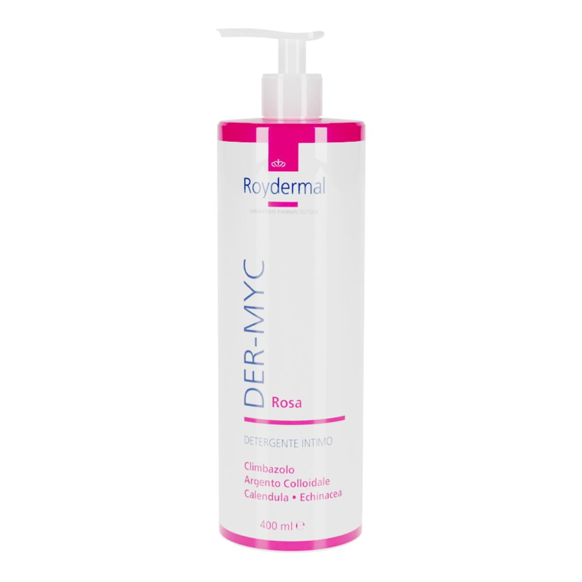 Detergente riequilibrante a pH 4.5 per il ripristino dell’acidità fisiologica delle mucose intime. Grazie ai suoi principi attivi e alla sua particolare ricchezza di componenti idratanti, Der-myc Rosa forma un film protettivo prevenendo le infezioni batteriche e micotiche vulvo-vaginali. Il climbazolo svolge spiccata attività antimicotica. L’argento colloidale ha attività antibatterica. Per la sua delicatezza è indicato per la detersione intima quotidiana sia maschile che femminile.