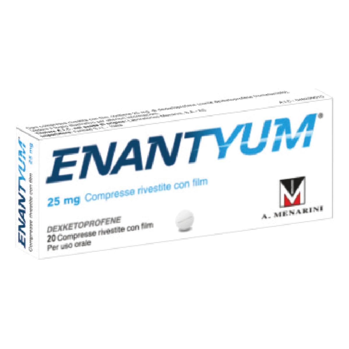 Usare con precauzione in pazienti con storia di condizioni allergiche. L’uso concomitante di Enantyum e altri FANS, compresi gli inibitori selettivi della ciclossigenasi 2 deve essere evitato. Gli effetti indesiderati possono essere minimizzati con l’uso della più bassa dose efficace per la più breve durata possibile di trattamento che occorre per controllare i sintomi (vedere paragrafo 4.2, e i paragrafi sottostanti sui rischi gastrointestinali e cardiovascolari). Sicurezza gastrointestinale Sanguinamento, ulcerazione o perforazione gastrointestinale, che possono essere fatali, sono stati riportati con tutti i FANS in varie fasi del trattamento, con o senza sintomi di avvertimento o precedente storia di gravi eventi gastrointestinali. In caso di comparsa di sanguinamento o ulcerazione gastrointestinale in pazienti in trattamento con Enantyum, si deve sospendere il trattamento. Il rischio di sanguinamento, ulcerazione o perforazione gastrointestinale aumenta con l’aumentare delle dosi di FANS, nei pazienti con storia di ulcera, soprattutto se complicata da emorragia o perforazione (vedere paragrafo 4.3) e nelle persone anziane. Anziani: gli anziani hanno una maggiore frequenza di reazioni indesiderate ai FANS, specialmente sanguinamento e perforazione gastrointestinale, che possono essere fatali (vedere paragrafo 4.2). Questi pazienti devono cominciare il trattamento con la minore dose possibile. Come per tutti i FANS, prima di iniziare il trattamento con dexketoprofene, bisogna indagare su pregresse storie di esofagiti, gastriti e/o ulcera peptica e assicurarsi della loro totale guarigione. Pazienti con sintomi gastrointestinali o storia di disturbi gastrointestinali devono essere attentamente sorvegliati per la comparsa di disturbi digestivi, specialmente sanguinamento gastrointestinale. I FANS devono essere somministrati con cautela a pazienti con storia di patologie gastrointestinali (colite ulcerosa, malattia di Crohn) in quanto le loro condizioni possono essere esacerbate (vedere paragrafo 4.8). Una terapia combinata con agenti protettivi (per es. misoprostolo o inibitori della pompa protonica) deve essere presa in considerazione per questi pazienti, e anche per i pazienti che assumono contemporaneamente acido acetilsalicilico a basso dosaggio o altri farmaci che possono aumentare il rischio gastrointestinale (vedere sotto e paragrafo 4.5). I pazienti con storia di tossicità gastrointestinale, in particolare se anziani, devono riferire qualsiasi sintomo addominale insolito (specialmente sanguinamento gastrointestinale) in particolare nelle fasi iniziali del trattamento. Si consiglia cautela nei pazienti che ricevono trattamenti concomitanti che possono aumentare il rischio di ulcerazione o sanguinamento, come i corticosteroidi orali, anticoagulanti come warfarin, inibitori selettivi del reuptake della serotonina o agenti antiaggreganti come l’acido acetilsalicilico (vedere paragrafo 4.5). Sicurezza renale Da usarsi con cautela in pazienti con compromissione della funzionalità renale. In questi pazienti, l’uso dei FANS può provocare un peggioramento della funzione renale, ritenzione di liquidi e edema. Cautela è richiesta anche in pazienti sotto terapia diuretica o in quei pazienti che possono sviluppare ipovolemia, a causa di un aumentato rischio di nefrotossicità. Durante il trattamento deve essere assicurato un adeguato apporto di liquidi per prevenire la disidratazione associata ad un possibile aumento della tossicità renale. Come tutti i FANS il medicinale può causare un aumento dell’azotemia e della creatininemia. Come per gli altri inibitori della sintesi delle prostaglandine, può essere associato ad effetti avversi a carico del rene che possono portare a nefrite glomerulare, nefrite interstiziale, necrosi papillare renale, sindrome nefrosica ed insufficienza renale acuta. I pazienti anziani tendono più facilmente ad avere funzione renale ridotta (vedere paragrafo 4.2). Sicurezza epatica Da usarsi con cautela in pazienti con compromissione della funzionalità epatica. Come gli altri FANS, il medicinale può causare lievi aumenti transitori di alcuni parametri epatici ed anche degli aumenti significativi delle AST e ALT. Nel caso si verifichi un significativo incremento di tali parametri, il trattamento deve essere interrotto. I pazienti anziani tendono più facilmente a soffrire di ridotta funzionalità epatica (vedere paragrafo 4.2). Sicurezza cardiovascolare e cerebrovascolare Un adeguato monitoraggio ed opportune istruzioni sono necessarie nei pazienti con storia di ipertensione e/o insufficienza cardiaca lieve o moderata. È necessaria una particolare cautela nei pazienti con storia di patologie cardiache, in particolare quelli con precedenti episodi di insufficienza cardiaca. In questi pazienti è stato infatti riportato un aumento del rischio di scatenare un’insufficienza cardiaca, poiché sono stati riscontrati ritenzione di liquidi e edema in associazione al trattamento con i FANS. Studi clinici e dati epidemiologici suggeriscono che l’uso di alcuni FANS (specialmente ad alti dosaggi e per trattamenti di lunga durata) può essere associato ad un modesto aumento del rischio di eventi trombotici arteriosi (ad es. infarto del miocardio o ictus). Non ci sono dati sufficienti per escludere un rischio simile per dexketoprofene. Conseguentemente, i pazienti con ipertensione non controllata, insufficienza cardiaca congestizia, cardiopatia ischemica accertata, malattia arteriosa periferica e/o malattia cerebrovascolare devono essere trattati con dexketoprofene solo dopo attenta valutazione. Analoghe considerazioni devono essere effettuate prima di iniziare un trattamento di lunga durata in pazienti con fattori di rischio per malattie cardiovascolari (ad es. ipertensione, iperlipidemia, diabete mellito, fumo). Tutti i FANS non selettivi sono in grado di inibire l’aggregazione piastrinica e prolungare il tempo di sanguinamento mediante l’inibizione