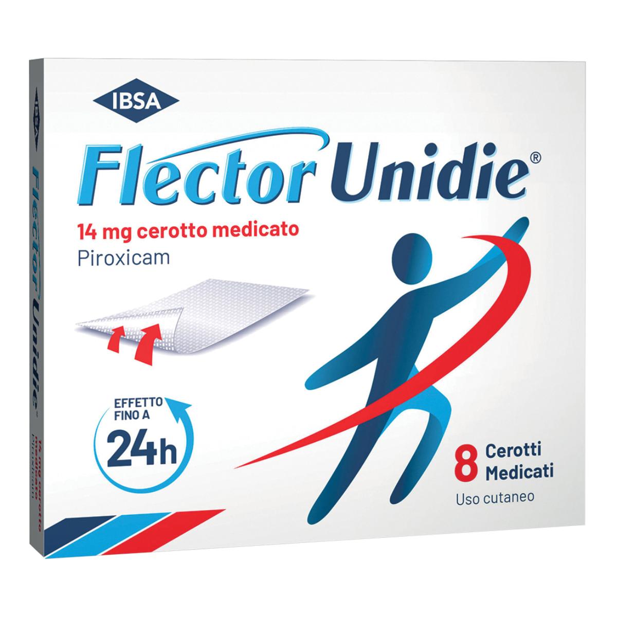 Posologia Si consiglia di usare un solo cerotto medicato per volta e sostituirlo ogni 24 ore per un periodo non superiore a 8 giorni. Non applichi due cerotti nell’arco dello stesso giorno. FLECTOR UNIDIE è da impiegarsi esclusivamente sulla cute integra. Modo di somministrazione Solo per uso cutaneo. Dopo aver accuratamente lavato e asciugato la zona dolorante, sfregare tra le dita uno degli angoli di FLECTOR UNIDIE per togliere la pellicola protettiva ed applicare la parte adesiva direttamente sulla cute. Nel caso in cui FLECTOR UNIDIE debba essere applicato ad articolazioni di maggiore mobilità, come ad esempio il gomito od il ginocchio, è consigliabile l’uso di un bendaggio di ritenzione da applicare all’articolazione flessa, al fine di mantenere il cerotto in sede. Non superare le dosi raccomandate. Evitare il contatto con gli occhi e le mucose.