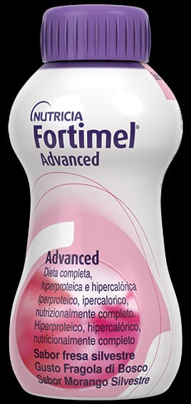 Supplemento nutrizionale orale completo, iperproteico (21 g di proteine per bottiglietta), ipercalorico (300 kcal per bottiglietta) a base di sieroproteine, con 3 g di leucina e un’alta concentrazione di aminoacidi essenziali. Fortimel Advanced è fonte di vitamina D e calcio. La presenza di macronutrienti e fibre prebiotiche lo rendono particolarmente indicato per il recupero massa muscolare, del peso corporeo, della performance fisica.