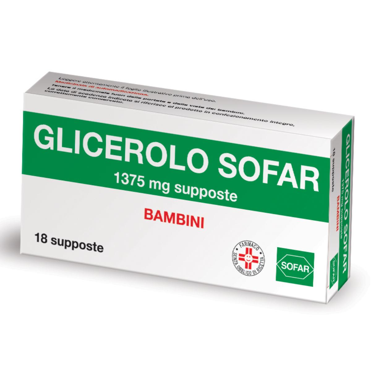 GLICEROLO Sofar Bambini 1375 mg supposte. Una supposta bambini contiene: principio attivo: Glicerolo 1375 mg GLICEROLO Sofar Adulti 2250 mg supposte. Una supposta adulti contiene: principio attivo: Glicerolo 2250 mg Per l’elenco completo degli eccipienti vedere paragrafo 6.1.