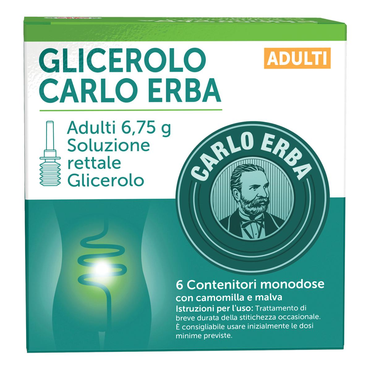 GLICEROLO CARLO ERBA Prima infanzia 900 mg supposte Una supposta prima infanzia contiene: principio attivo: Glicerolo 900 mg. GLICEROLO CARLO ERBA Bambini 1375 mg supposte Una supposta bambini contiene: principio attivo: Glicerolo 1375 mg. GLICEROLO CARLO ERBA Adulti 2250 mg supposte Una supposta adulti contiene: principio attivo: Glicerolo 2250 mg. GLICEROLO CARLO ERBA Bambini 2,25 g soluzione rettale Ogni contenitore monodose contiene: principio attivo: Glicerolo 2,25 g. GLICEROLO CARLO ERBA Adulti 6,75 g soluzione rettale Ogni contenitore monodose contiene: principio attivo: Glicerolo 6,75 g. Per l’elenco completo degli eccipienti, vedere paragrafo 6.1.