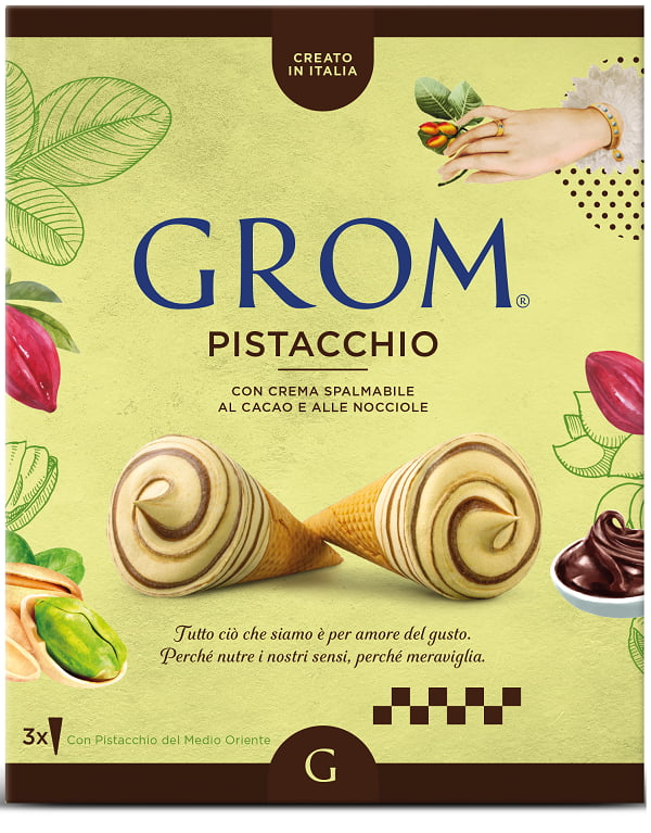 Gelato al pistacchio (61%)[latte fresco pastorizzato di alta qualità (52%), zucchero, pasta di pistacchio (10%), panna fresca pastorizzata (7%), tuorli d’uovo, proteine del latte, destrosio, addensante (farina di carrube), sale], cialda (17%)[zucchero, farina di mais, amido di mais, olio di cocco, emulsionante (lecitina di girasole), sale], variegatura al cacao e alle nocciole (14%)[zucchero, oli vegetali (olio di girasole, olio di cocco), nocciole tostate (20%), cacao magro in polvere (13%), emulsionante (lecitina di girasole)], copertura al cacao magro (8%)[oli vegetali (olio di cocco, olio di girasole), zucchero, cacao magro in polvere (16%), emulsionante (lecitina di soia)].