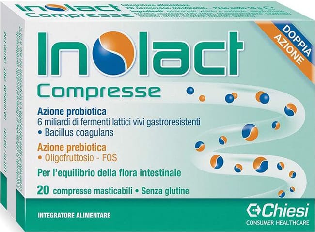 Inolact è un integratore alimentare ad attività simbiotica costituito dall’associazione di fermenti lattici (componente probiotica) con Frutto-oligosaccaridi (FOS)(componente prebiotica).