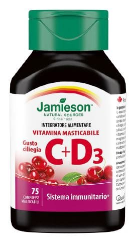 Integratore alimentare di vitamina C e vitamina D. La vitamina C è utile per la normale funzione del sistema immunitario. Gusto ciliegia.