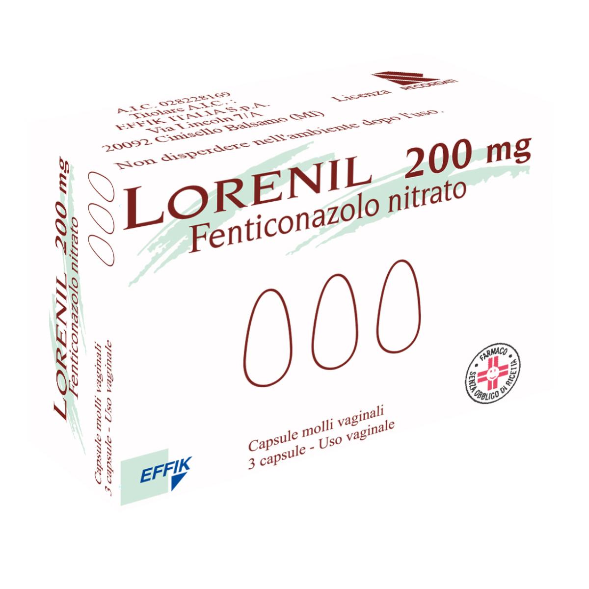 LORENIL 200 mg Capsule molli vaginali Ogni capsula molle contiene: fenticonazolo nitrato 200 mg. Per l’elenco completo degli eccipienti vedere paragrafo 6.1 LORENIL 600 mg Capsule molli vaginali Ogni capsula molle contiene: fenticonazolo nitrato 600 mg. Per l’elenco completo degli eccipienti vedere paragrafo 6.1.