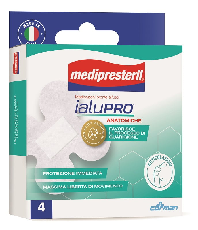Confezione contenente 4 medicazioni pronte all’uso anatomiche per articolazioni misura 10×10 cm.