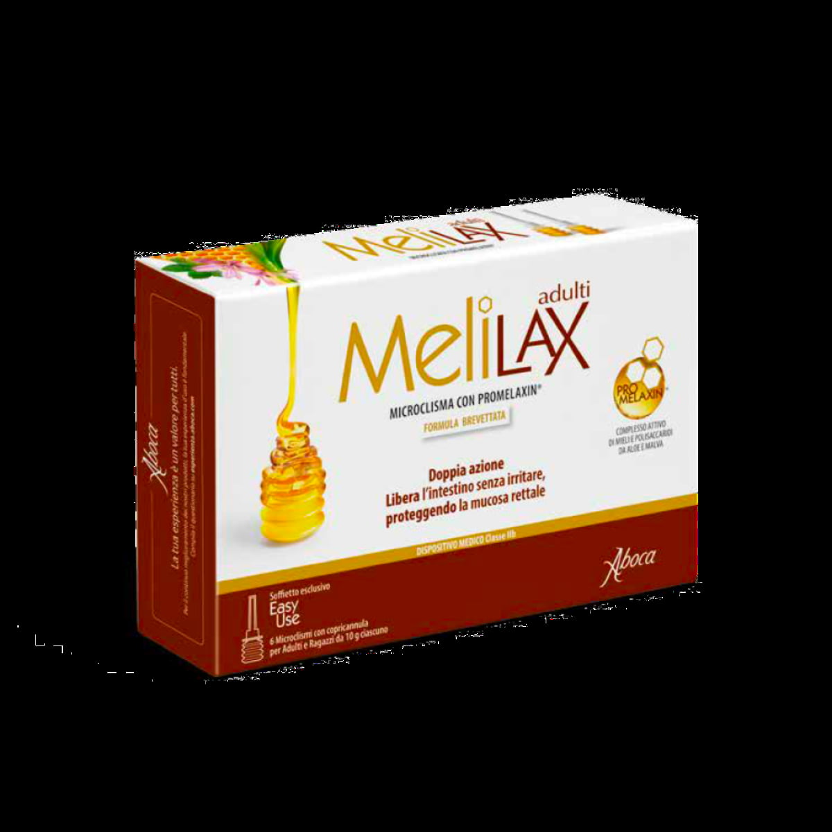 La doppia azione di Melilax è ottenuta grazie a PROMELAXIN, un complesso attivo di mieli di nettare e di melata appositamente selezionati e lavorati in base al loro contenuto di monosaccaridi, polisaccaridi e melanoidine, arricchito con la frazione polisaccaridica da Aloe e Malva.