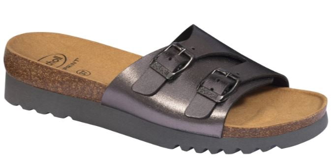 La classica tomaia a fascia Scholl viene rivisitata in questo stile pratico e aggiustabile grazie all’iconica doppia fibbia. L’effetto metallizzato regala contemporaneità e versatilità a questo stile. La calzatura è inoltre flessibile, leggera e dotata di tecnologia Scholl Bioprint dal caratteristico plantare in sughero naturale e gomma disegnato per mantenere il piede nella corretta posizione.