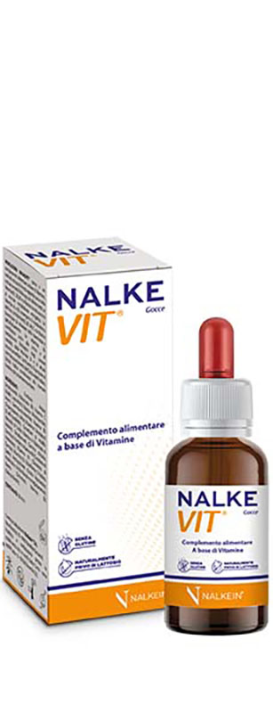 NALKEVIT® gocce è un complemento alimentare a base di Vitamine, indicato nei casi di ridotto apporto con la dieta o di aumentato fabbisogno di tali elementi. Le Vitamine B1, B2, B5 e la Niacina contribuiscono al normale metabolismo energetico. Le Vitamine A e B2 sostengono il metabolismo del Ferro, le Vitamine B2, B5, B6, C e la Niacina favoriscono la riduzione della stanchezza e dell’affaticamento. La vitamina B5 contribuisce anche alla sintesi e al metabolismo fisiologico degli ormoni steroidei, della Vitamina D e di alcuni neurotrasmettitori. La Vitamina D presiede al normale assorbimento del Calcio e del Fosforo. L’Acido Folico contribuisce alla normale funzione del sistema immunitario.