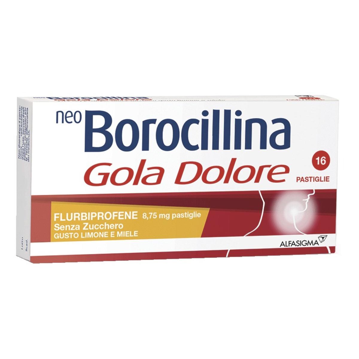 Alle dosi consigliate, nell’usare il medicinale nelle sue diverse forme farmaceutiche, l’eventuale deglutizione non comporta, di per sé, alcun danno per il paziente, in quanto tali dosi sono ampiamente inferiori a quelle comunemente utilizzate nei trattamenti con il flurbiprofene per via sistemica. In pazienti con insufficienza renale, cardiaca o epatica il medicinale NEO BOROCILLINA GOLA DOLORE deve essere utilizzato con cautela. È consigliato non associare il medicinale con i FANS. L’uso, specie se prolungato, del prodotto può dare origine a fenomeni di sensibilizzazione o di irritazione locale; in tali casi occorre interrompere il trattamento e consultare il medico per istituire, se necessario, una terapia idonea. Non usare per trattamenti protratti. Dopo breve periodo di trattamento senza risultati apprezzabili consultare il medico. NEO BOROCILLINA GOLA DOLORE collutorio e NEO BOROCILLINA GOLA DOLORE spray per mucosa orale (tutte le presentazioni) contengono: – 960 mg di etanolo per 10 ml di collutorio. Può causare sensazione di bruciore sulla pelle danneggiata. – olio di ricino poliossidrato idrogenato che può causare reazioni sulla pelle localizzate. – paraidrossi benzoati che possono causare reazioni allergiche (anche ritardate). NEO BOROCILLINA GOLA DOLORE 0,25% spray per mucosa orale gusto arancia e miele e NEO BOROCILLINA GOLA DOLORE 0,25% spray per mucosa orale gusto limone e miele contengono anche il colorante giallo tramonto (E110), che può causare reazioni allergiche.NEO BOROCILLINA GOLA DOLORE 8,75 mg pastiglie (tutte le presentazioni) contiene isomalto: i pazienti affetti da rari problemi ereditari di intolleranza al fruttosio, non devono assumere questo medicinale.