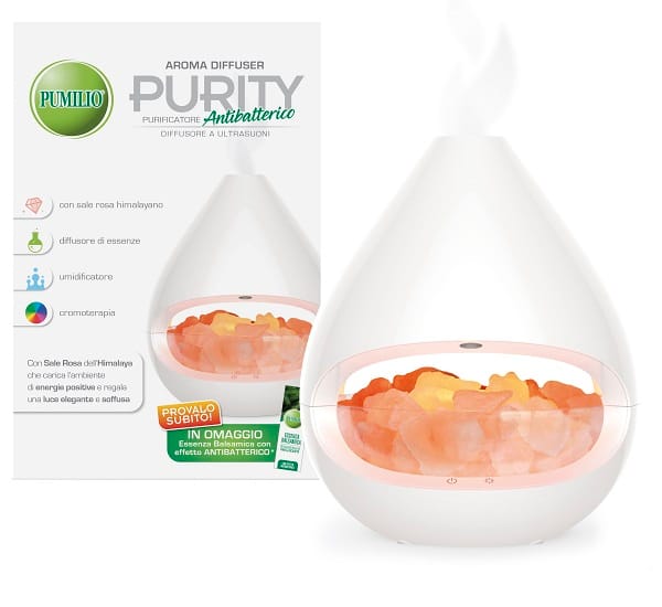 La confezione contiene: 1 diffusore, 1 alimentatore, 2 lampadine per la cromoterapia, 1 misurino per l’acqua, 1 sacchetto di sale rosa dell’Himalaya da 1 kg, 1 Pumilio Essenza Balsamica da 10 ml.
