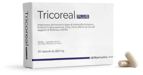 Tricoreal PLUS è un integratore alimentare a base di metilsulfonilmetano, N-acetil D-glucosamina, zinco, ferro, rame ed estratti vegetali di serenoa e perilla, indicato in caso di scarso apporto con la dieta o aumentato fabbisogno di tali nutrienti. Il rame contribuisce alla normale pigmentazione dei capelli, mentre lo zinco contribuisce al mantenimento di capelli e unghie normali. L’N-acetil D-glucosamina interviene nella sintesi dell’acido ialuronico.