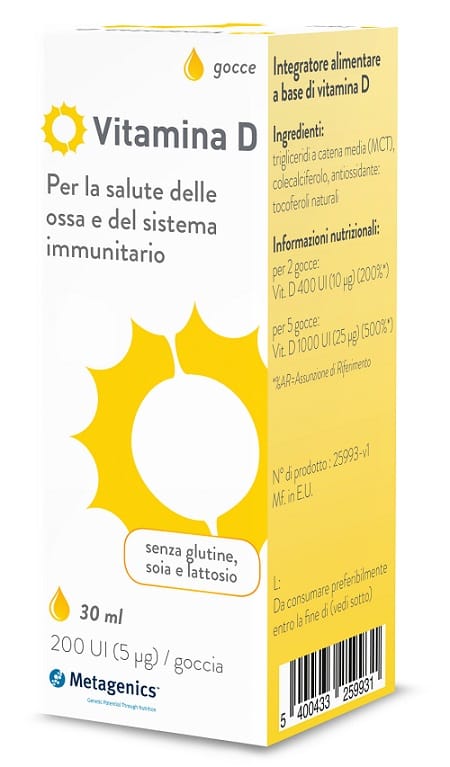 Ogni goccia di vitamina D liquido contiene 200 UI (5 mcg) di colecalciferolo; questo permette una pratica somministrazione giornaliera personalizzabile in base all’età e alle esigenze del soggetto.